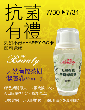 列印兌換券+HAPPY GO卡即可兌換天然有機茶樹潔膚乳